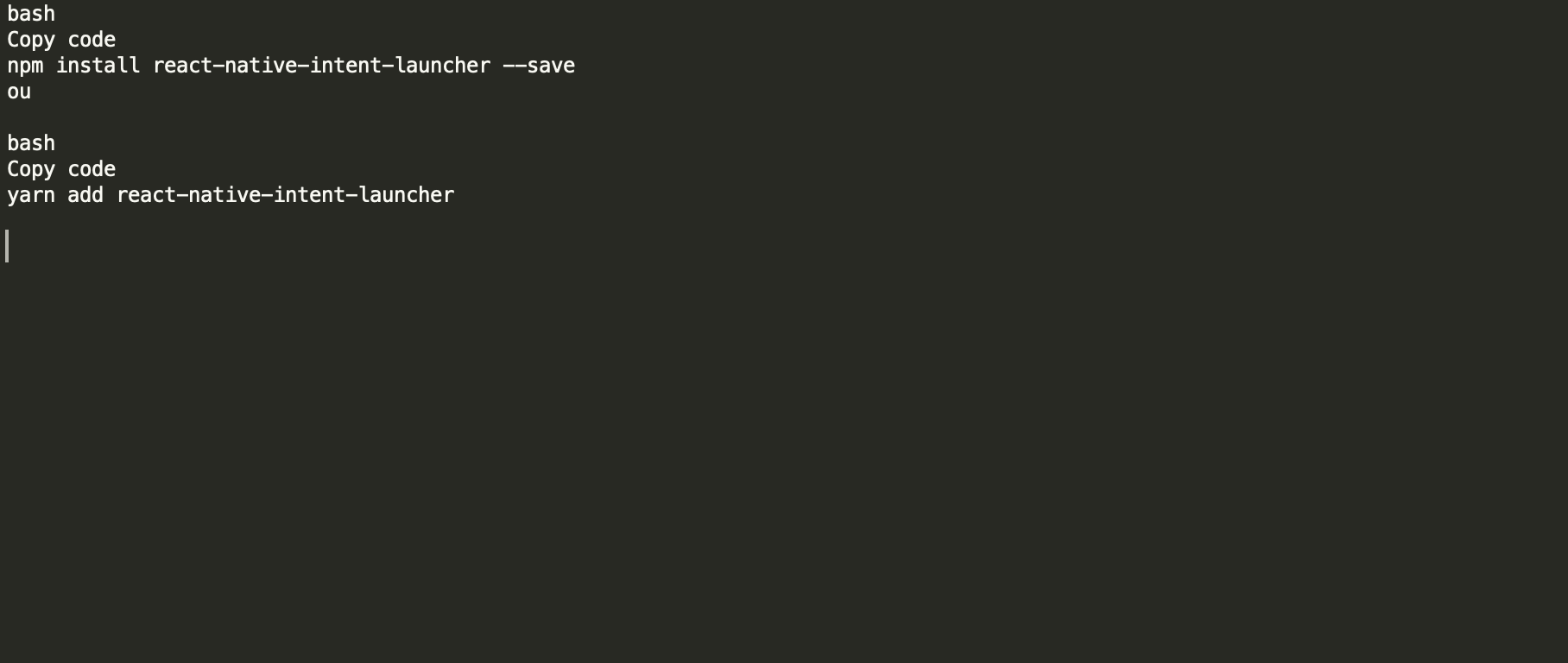 Pour interagir avec d’autres applications, nous allons utiliser la bibliothèque react-native-intent-launcher. Installez-la en utilisant npm ou yarn :