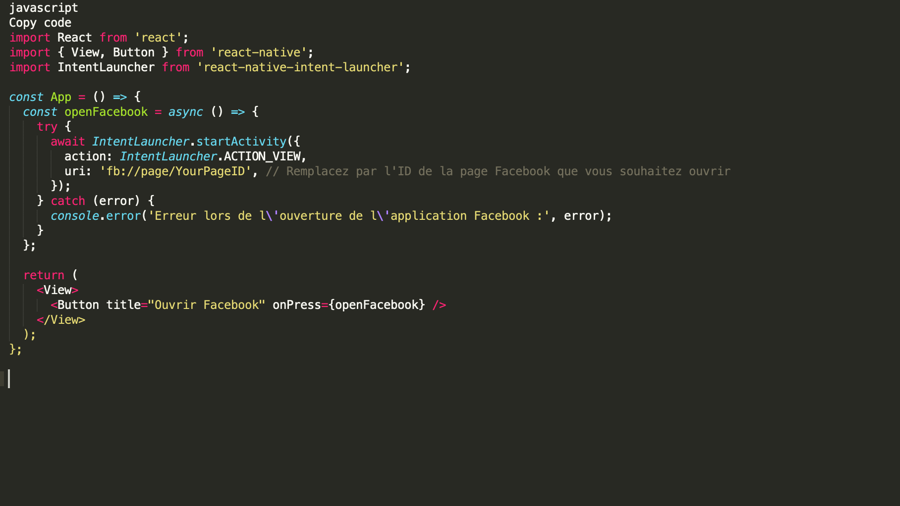 Maintenant que notre projet est configuré pour utiliser react-native-intent-launcher, nous pouvons créer notre bouton d’interaction. Nous allons créer un bouton qui, lorsqu’il est pressé, ouvrira l’application Facebook. Vous pouvez bien sûr personnaliser cette étape pour l’adapter à vos besoins.